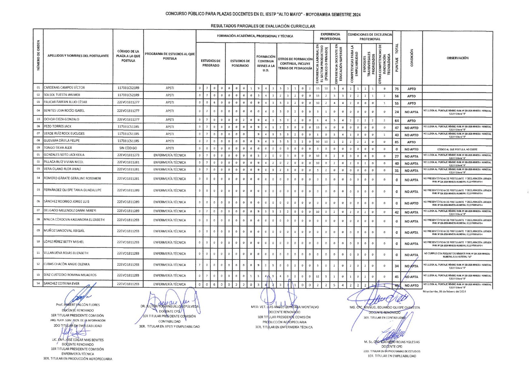 RESULTADOS PARCIALES DE EVALUACIÓN CURRICULAR-2024